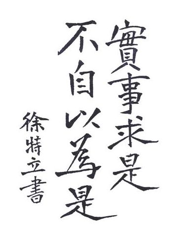 “实事求是,不自以为是”是老院长徐特立的思想。1942年4月1日,徐特立在担任我校前身——自然科学院院长期间,组织开展了为期9个月的教育方针大讨论,并在《解放日报》上发表了《再论我们怎样学习》一文,提出了“实事求是”,不要“自以为是”的思想。1949年10月,徐特立为《河北教育》创刊号题写了“实事求是,不自以为是”九个字,并说明这是学风中最重要的。