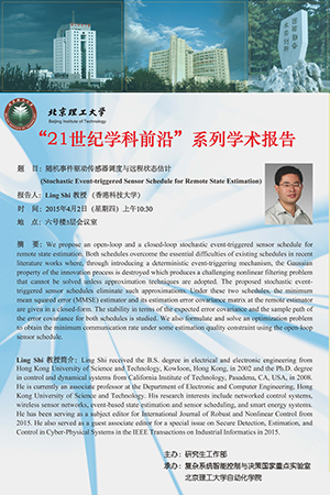 施凌教授于2002年获得香港科技大学理学学士学位,2008年获得美国加州理工学院哲学博士学位。现任香港科技大学电子与计算机工程系副教授。施凌教授的研究方向主要包括网络化控制系统,无线传感器网络,事件驱动状态估计与传感器调度,智能能源系统等,在控制与信号处理领域顶级国际刊物Automatica, IEEE Transactions on Automatic Control, IEEE Transactions on Signal Processing, Systems & Control Letters上发表论文40余篇。现担任控制领域国际期刊International Journal of Robust and Nonlinear Control编委,并担任IEEE Transactions on Industrial Informatics特刊Secure Detection, Estimation, and Control in Cyber-Physical Systems客座编辑。