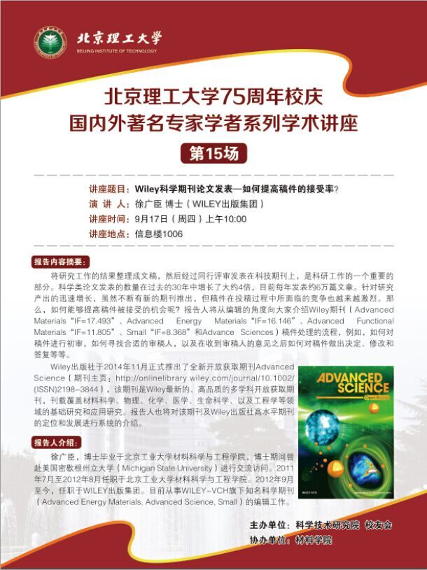 北京理工大学75周年校庆国内外著名专家系列讲座第十五期预告:Wiley科学期刊论文发表—如何提高稿件的接受率
