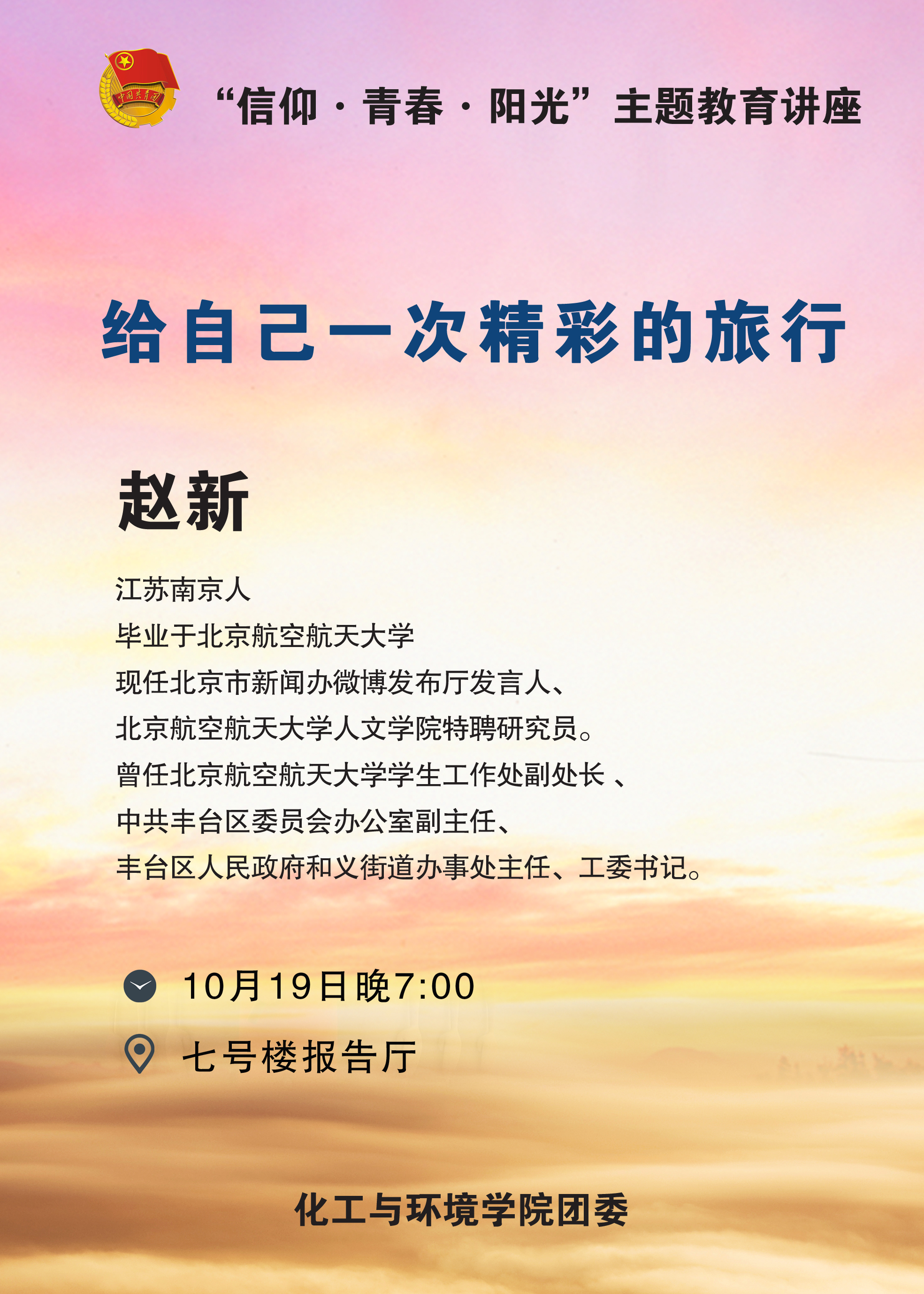 化工与环境学院团委有幸邀请到丰台区人民政府和义街道办公室主任、工委书记赵新老师为同学们做一场精彩的主题教育讲座,欢迎广大老师、青年同学聆听。