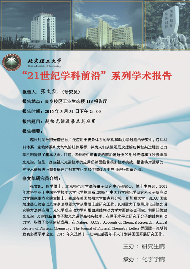 【化学学院】“21世纪学科前沿”张文凯研究员学术报告通知