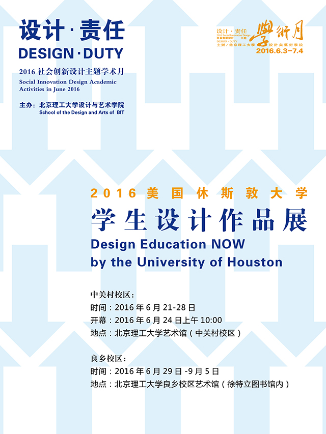 2016“设计·责任”主题学术月系列展览之一,美国休斯敦大学学生设计作品展将于6月21-28日在北京理工大学艺术馆(中关村校区)展出,展览开幕式将于24日上午10:00进行。