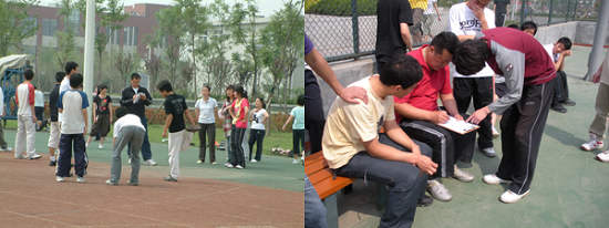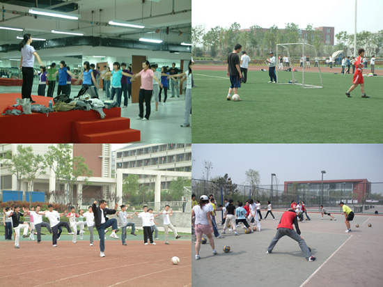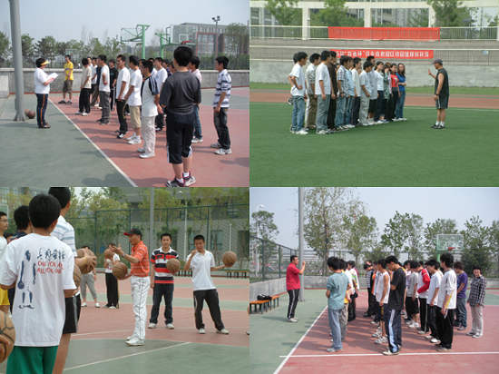 体育课程组自2007年九月以来,在良乡校区承担着07、08级两个年级6200余名本科生的体育课教学任务,周学时达300学时,每天约有13名教师,每位教师承担着4-6学时/天的课程,教学任务十分繁重,工作条件十分艰苦,但每位教师一切为了教学,无论是烈日炎炎,还是寒风习习,大家克服困难,保持着良好乐观、积极向上的心态,为了学生上好每堂课。