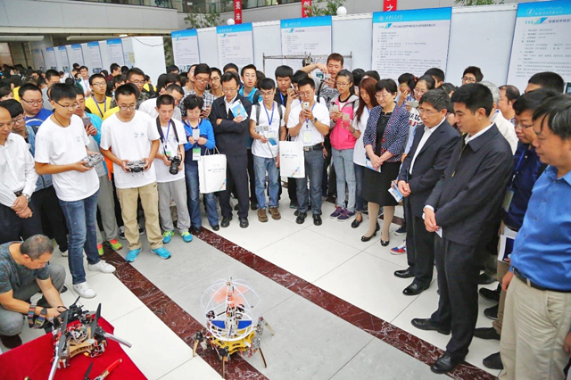 在精彩纷呈、竞争激烈的展示中,北京理工大学两项参展作品——“‘飞天灵蛛’机器人”和“新型鼠笼式陆空两栖无人机”得到了与会者的高度关注。这两件机器人实物作品外形炫酷、功能强劲、性能卓异、演示精彩,得到了与会专家和学生的高度评价,在年会现场产生了极大的轰动。