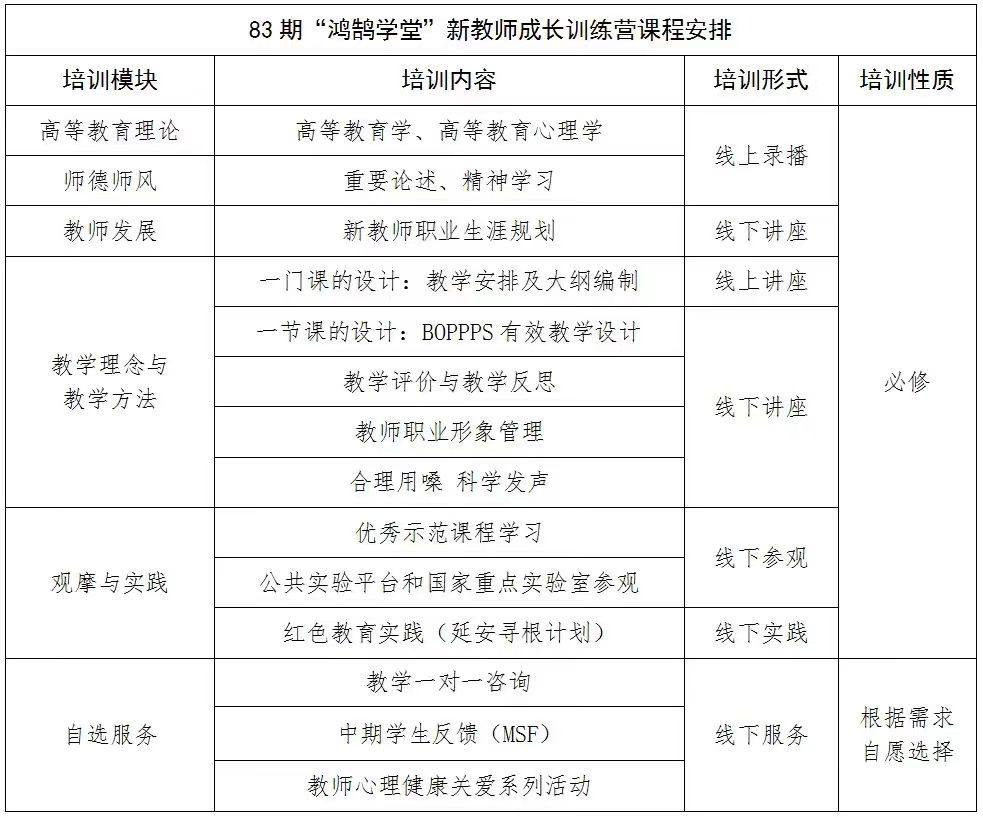 为深入贯彻《中华人民共和国教师法》和全国教育大会精神,落实学校关于加强师德师风建设、加大教师培训力度的有关要求,根据新入职教师岗位要求,新入校教师应在一年内完成岗前培训全部课程,通过考核后获得《北京理工大学教师岗前培训合格证书》。我校现开展第83期“鸿鹄学堂”新教师成长训练营,并将培训有关事项通知如下:
