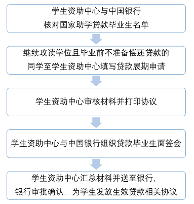 已办理校园地国家助学贷款的同学如需继续攻读学位,并且毕业前不准备偿还贷款,可申请办理贷款展期,贷款展期即将现有贷款办理延期申请,变更还款期限,在继续攻读学位期间贷款利息由国家补贴无需个人承担,待继续攻读学位完成后开始还款。具体办理流程如下: