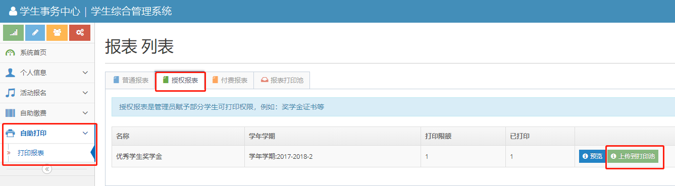 第一步: 需自助打印证书学生请在http://ssc.info.bit.edu.cn/单点登录,进入如下界面,点击自助打印——打印报表——选择要打印的奖项上传到打印池;