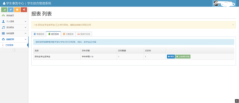 第一步: http://ssc.info.bit.edu.cn/单点登录,进入如下界面,点击自助打印——打印报表——选择要打印的奖项上传到打印池;