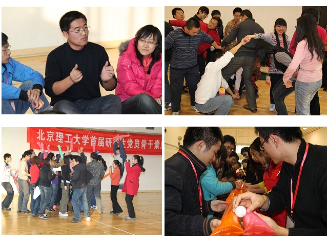 11月29日下午,“奏响党旗下的青春之歌”2009-2010年北京理工大学研究生党员骨干培训班素质拓展训练在我校体育馆热身馆举行。党员骨干班100名学员每20人一组分成5组,在我校社会工作专业学生组成的教练团的带领下开展了内容丰富、形式多样的素质拓展训练。