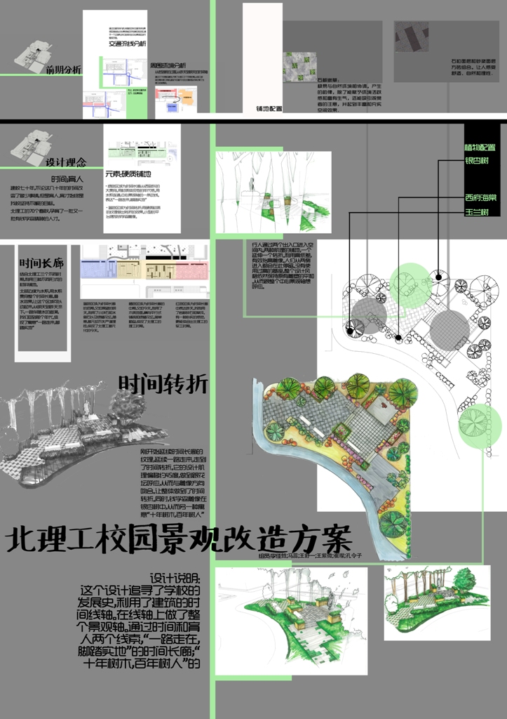 本次展出的方案,作者均为设计学院环境艺术设计系2010级本科生,在专业老师的指导下,学生们将校园景观改造与城市公共空间景观设计、植物景观设计课程学习相结合。在大学生校园景观需求调研、校园植物分析、钱学森像及周边环境分析的基础上,组成七个设计小组分别开展方案设计。所展出的五组方案,通过五个不同方向的设计尝试——小广场主题、植物群落主题、微地形主题、时间寓意主题以及思想迸发主题为立意展开钱学森像的迁移改造景观设计,以求创造美好的校园景观环境,对北京理工大学的校园景观改造作出自己的贡献。