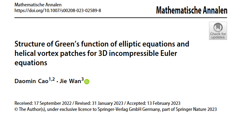 日前,北京理工大学数学与统计学院万捷副研究员在国际学术期刊《Mathematische Annalen》发表题为“Structure of Green’s function of elliptic equations and helical vortex patches for 3D incompressible Euler equations”的研究论文。该论文给出了散度型二阶椭圆算子Green函数的展开公式,并由此证明了无限管道区域上三维不可压缩欧拉方程集中到涡丝方程的螺旋对称涡补丁解的存在性和轨道稳定性。某种程度上给出了涡丝猜想在螺旋对称情形下的一个证明。