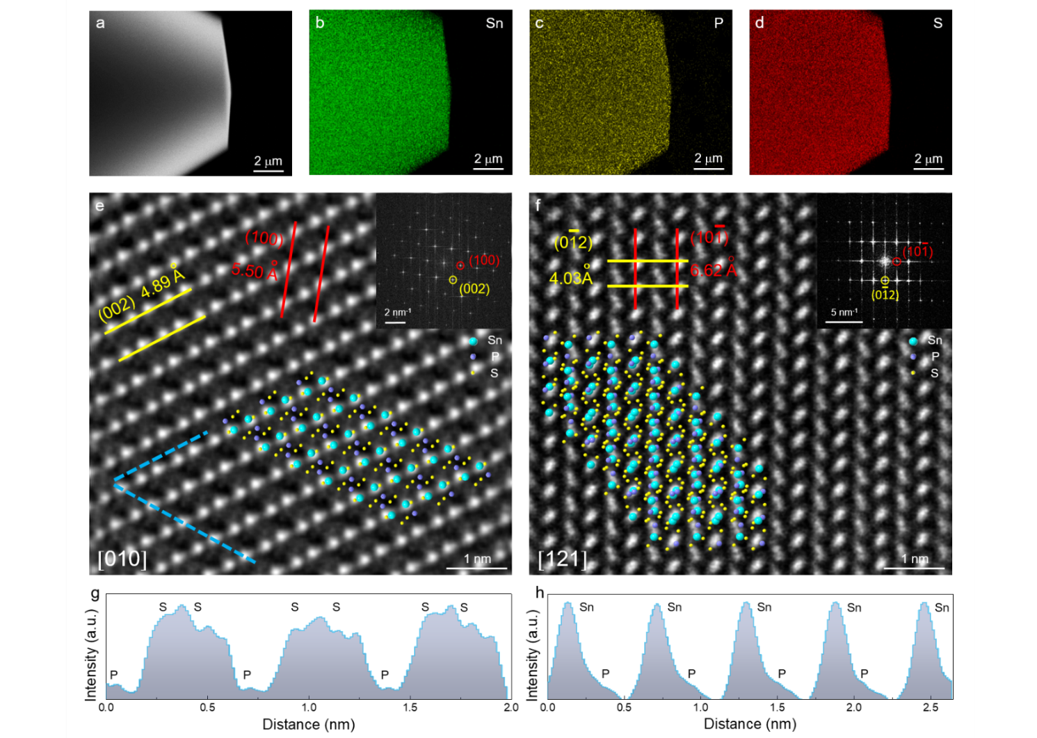通过能量色散x射线能谱(EDX)和高角环形暗场扫描透射电镜(HAADF-STEM)进一步研究合成的SnPS3的晶体结构。EDX测定Sn:P:S = 1.1:1:2.95,与化学计量比一致。此外,HAADF-STEM截面图显示SnPS3具有高的结晶质量,不存在原子空位。进一步结合选区电子衍射(SAED)分析,可以确定(002)和(100)的晶面间距为4.89 Å和5.50 Å。HAADF-STEM原子强度分布图的周期性变化表明Sn、P、S原子排列规律,Sn-Sn原子键长可确定为5.80 Å。以上结果表明SnPS3的晶体结构具有高复杂性和低对称性,是研究非线性光学(NLO)性质的合适候选材料。