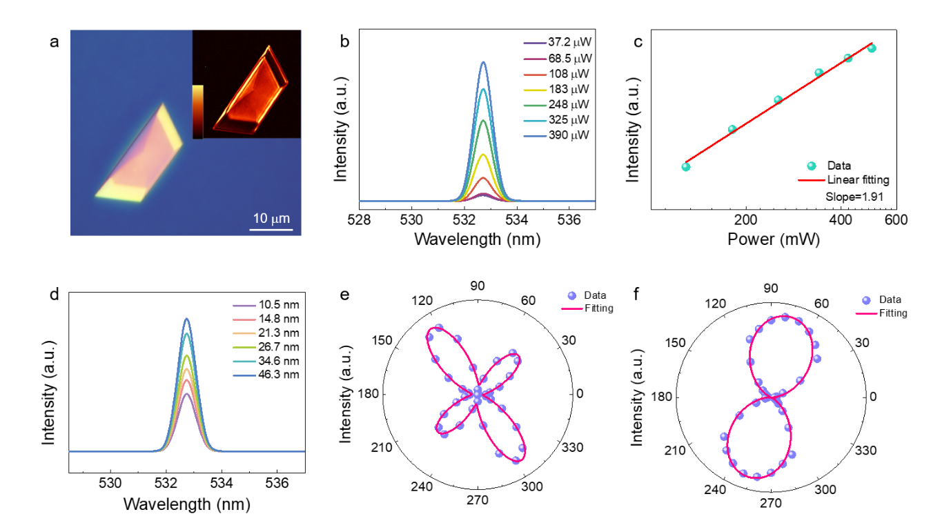 SHG源于入射光场下材料的二阶NLO偏振,是识别TMPCs晶体结构的有效技术手段。具体来说,频率为w的入射光子与NLO材料相互作用,产生频率为2w的光辐射。本工作主要研究了1064 nm激光(15 ps,80 MHz)下的SHG测量。在功率依赖性SHG光谱中,可以清晰地观测到位于532 nm处的单峰, SHG强度在对数坐标中线性拟合的斜率值1.91接近理论值2,符合二阶NLO过程的特征。