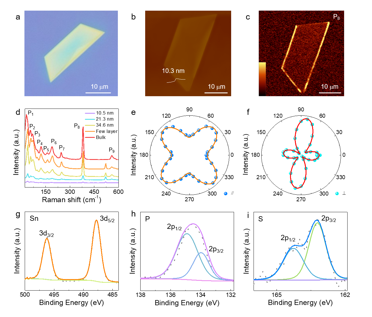 以SnPS3为例,样品形貌呈梯形,横向尺寸约为30 μm,厚度为10.3 nm。拉曼光谱中共观测到P1 (38.9 cm-1)、P2 (57.8 cm-1)、P3 (72.1 cm-1)、P4 (120.5 cm-1)、P5 (160.9 cm-1)、P6 (192.8 cm-1)、P7 (248.7 cm-1)、P8 (381.3 cm-1)和P9 (560.1 cm-1) 9个峰,其中P1、P2、P5和P7峰属于Ag模式,P3、P4和P9峰分别属于Bg模式。所有拉曼峰均表现出角度依赖特征,在平行配置中,P1、P2、P3、P5、P7和P8的强度表现为4叶模式, P4、P6和P9的强度表现为2叶模式。而在垂直配置下,除P6外,其余8个拉曼峰均呈现4叶模式。这种现象可以通过经典的Placzek近似强度来理解,它与|ei•R•es|2成正比,其中ei表示入射激光的单位偏振矢量,R表示拉曼张量,es表示平行或垂直散射拉曼信号的单位偏振矢量。此外,x射线光电子能谱(XPS)实验和拟合数据的一致性进一步证明了SnPS3高的晶体质量。
