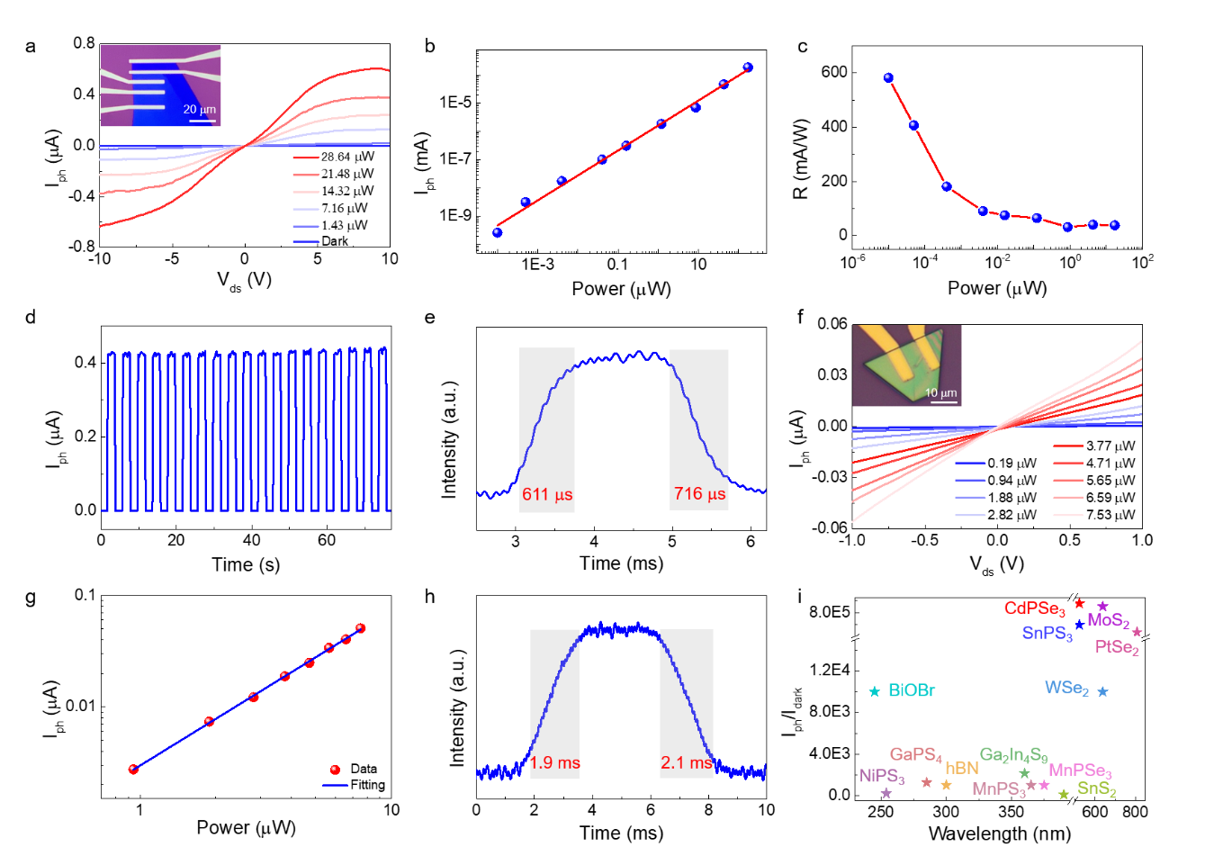 为了进一步研究其光电性能,制备了基于CdPSe3和SnPS3纳米片的光电探测器。所有测试均采用520 nm激光。不同功率强度下,CdPSe3器件的功率依赖性光电流的对数形式与功率密度呈正相关。通过Iph≈Pθ可以很好地拟合,其中θ是与光响应强度相关的指数。此外,线性动态范围(LDR)是光电探测器的一种性能指标,用于表征光强范围,在此范围内光电探测器保持恒定的响应率。根据LDR = 20log(Iph/Idark)的公式计算得出光敏LDR为120 dB,远大于商用InGaAs光电探测器的66 dB和其他二维材料如GaPS4的62 dB。基于CdPSe3的光电探测器响应度可高达582 mA/W,对应的比探测率为3.19´1011 Jones,对可见光的探测能力极佳。上升时间和衰减时间分别为611 ms和716 ms,优于大多数其它已报道的二维TMPCs光电探测器。值得注意的是,CdPSe3和SnPS3光电探测器由于其超低暗电流,比其它报道的二维材料具有更高的开关比。