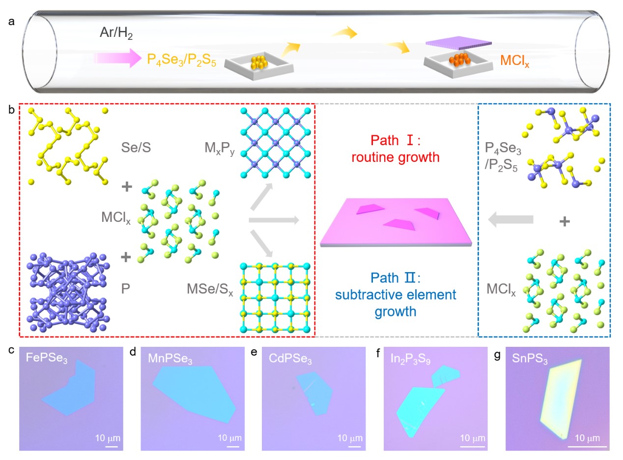 该工作不仅为三元TMPCs的合成开辟了一条新途径,还展示了一种通用的生长策略,对理解二维三元材料的生长机制具有重要意义。基于所提出的策略制备的二维三元晶体将为探索包括非线性光学、铁磁、光电、自旋电子学等新奇物性提供可能性。