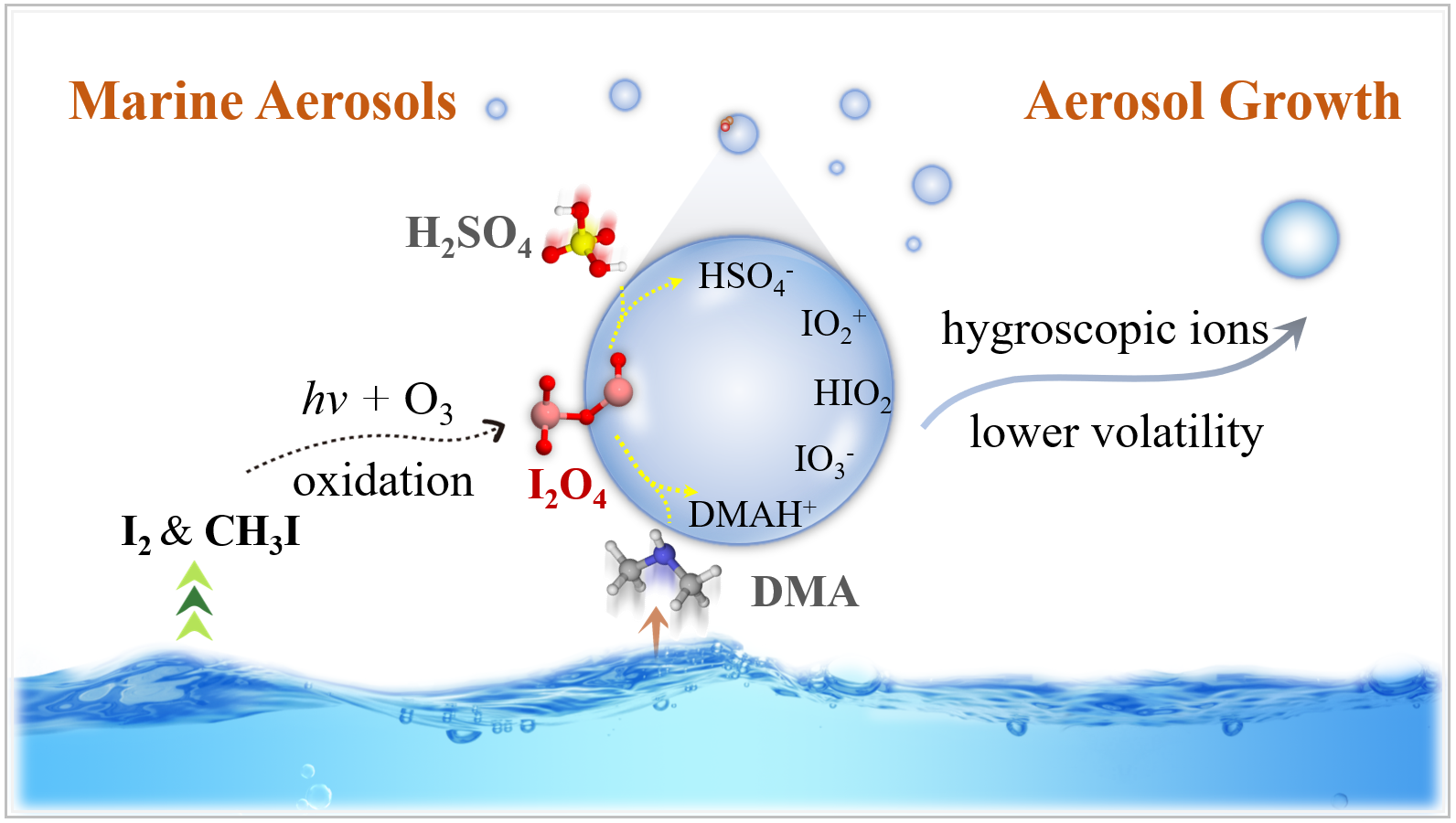 海洋气溶胶构成了全球最大的自然源气溶胶体系,对全球的辐射平衡、气候变化乃至人们的生活都有着重要影响。尽管已有研究表明含碘物质与海洋气溶胶的形成密切相关,但其参与的气溶胶增长机制尚不清楚。已有实验室研究表明,碘氧化物(I x O y )是气溶胶粒子形成的重要组分(其中四氧化二碘I2O4浓度最高)。然而,外场检测到的气溶胶粒子的主要碘组分为IO3-离子,却未检测到碘氧化物。实验室与外场观测上的分歧难以用当前的化学反应机制来解释,这很大程度上限制了人们对碘氧化物如何影响海洋气溶胶形成的理解。