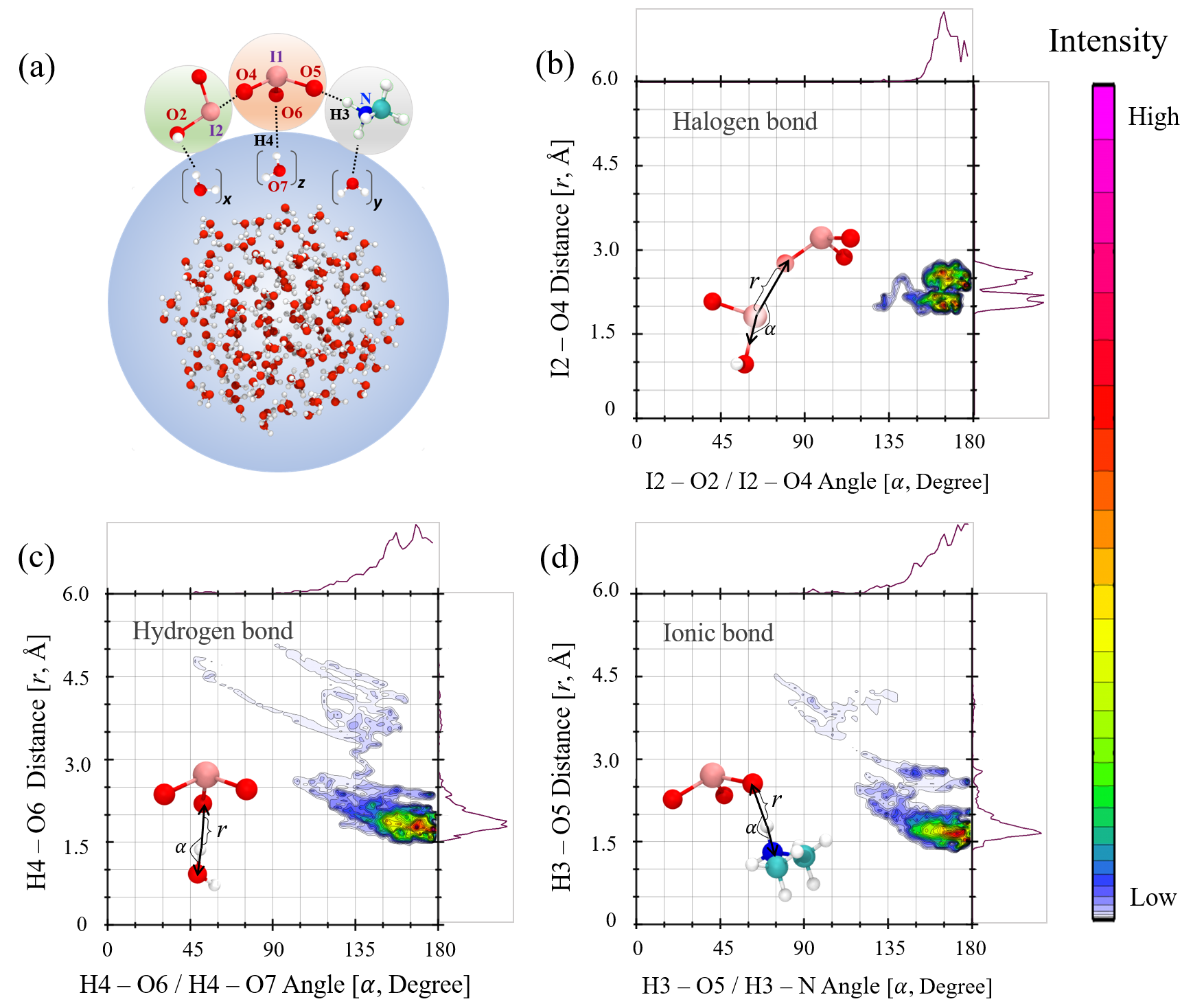 北京理工大学张秀辉教授团队及其合作者通过量子化学计算与第一性原理分子动力学模拟相结合的方案揭示的大气中硫酸和胺类物质影响下的I2O4的气-液界面(即液相气溶胶表面)上的非均相反应机制则较好地解释了上述分歧问题。由于真实大气中的化学组分远比“单纯”的实验环境更为复杂,除碘氧化物外,还存在着污染物硫酸、以及海洋类生物排放生成的胺类组分。她们合作研究发现,在硫酸和有机胺的参与下,I2O4可在气溶胶气-液界面快速(皮秒级别)反应(图1)生成亚碘酸HIO2以及一系列离子产物,如HSO4-、IO3-、DMAH+等。所生成的反应产物间可通过氢键、卤键和离子键结合为尺寸更大的复合物,进而限制其向液滴体相的扩散;同时,界面水分子通过氢键与产物分子结合,使其难以蒸发至气相(图2)。且上述附着于液滴表面的产物(IO3-/DMAH+等)相比于反应物(I2O4/DMA等)有更低的挥发性和更高的吸湿性(图3),还可促进气溶胶的吸湿性增长。