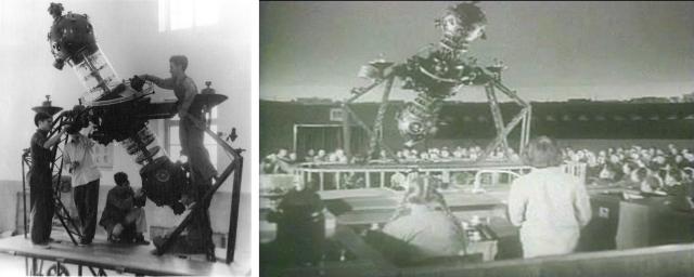 左:学校师生研制的中国首台大型天象仪(1958年首台原理样机);右:中国首台大型天象仪原理样机在北京天文馆进行演示