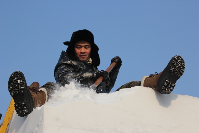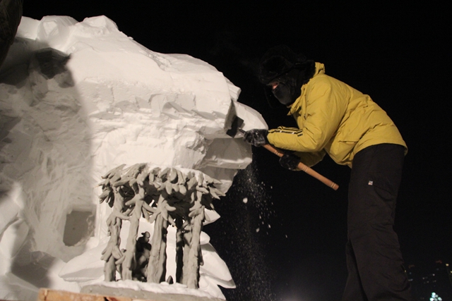 第一天的工作是“出大型”,出大型可是力气活,面对高达三米的雪方,同学们需要用脚手架、梯子、平刀、叉子等工具让雪方呈现了一个初步的雏形。表面上“出大型”的工作是个力气活儿,事实上其中的精妙只有从事过雪雕制作的人才能体会——“出大型”工作往往存在各种悖论,如果不用力,效率就比较低;如果太用力,往往就会打乱原先的框架。虽然天气寒冷,但是同学们怕穿着太厚行动不便影响工作效率,只能穿着基础的御寒衣服在冰天雪地里工作。为了感觉不那么冷,同学们一刻不停地铲着雪,用劳动的热浪驱走刺骨的寒冷。