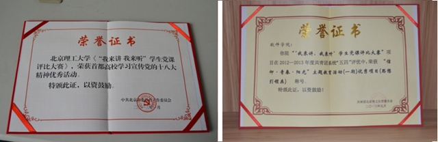 北京市“首都高校学习宣传党的十八大精神优秀活动”、“北京高校创先争优先进基层党组织”,连续两年在北京理工大学“信仰?青春?阳光”主题教育活动评比中被评为校级优秀项目,在国内核心期刊《学校党建与思想教育》上发表论文《基于党课评比大赛的大学生思想政治教育创新研究》……这些骄人的称号和成果正是软件学院学生党建工作所取得的突出成绩。